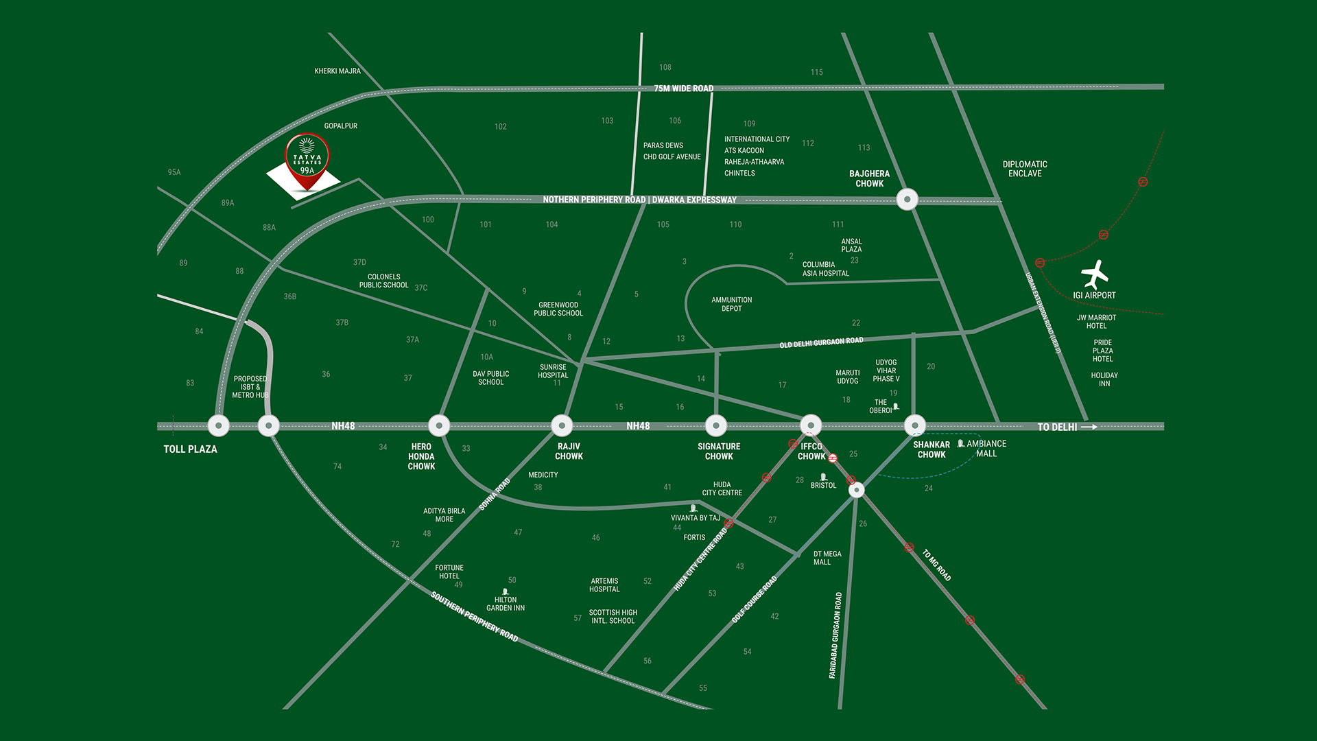 Strategically located on Dwarka Expressway, Tatva Estates enjoys excellent connectivity to key hubs in and around Gurgaon and Delhi NCR. Its proximity to the Indira Gandhi International Airport (20 minutes), Gurugram Railway Station (30 minutes), and HUDA City Centre Metro Station (40 minutes) makes commuting seamless and convenient.