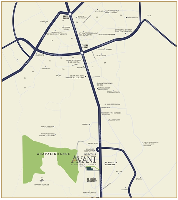 Located just 15 minutes from Vatika Chowk & Golf Course Extension Road, Avani Floors enjoys seamless connectivity to Sohna Road, the upcoming metro corridor, and key destinations across Gurugram and NCR. Residents have everything within reach – from leading schools and universities to renowned healthcare, retail, and entertainment hubs.