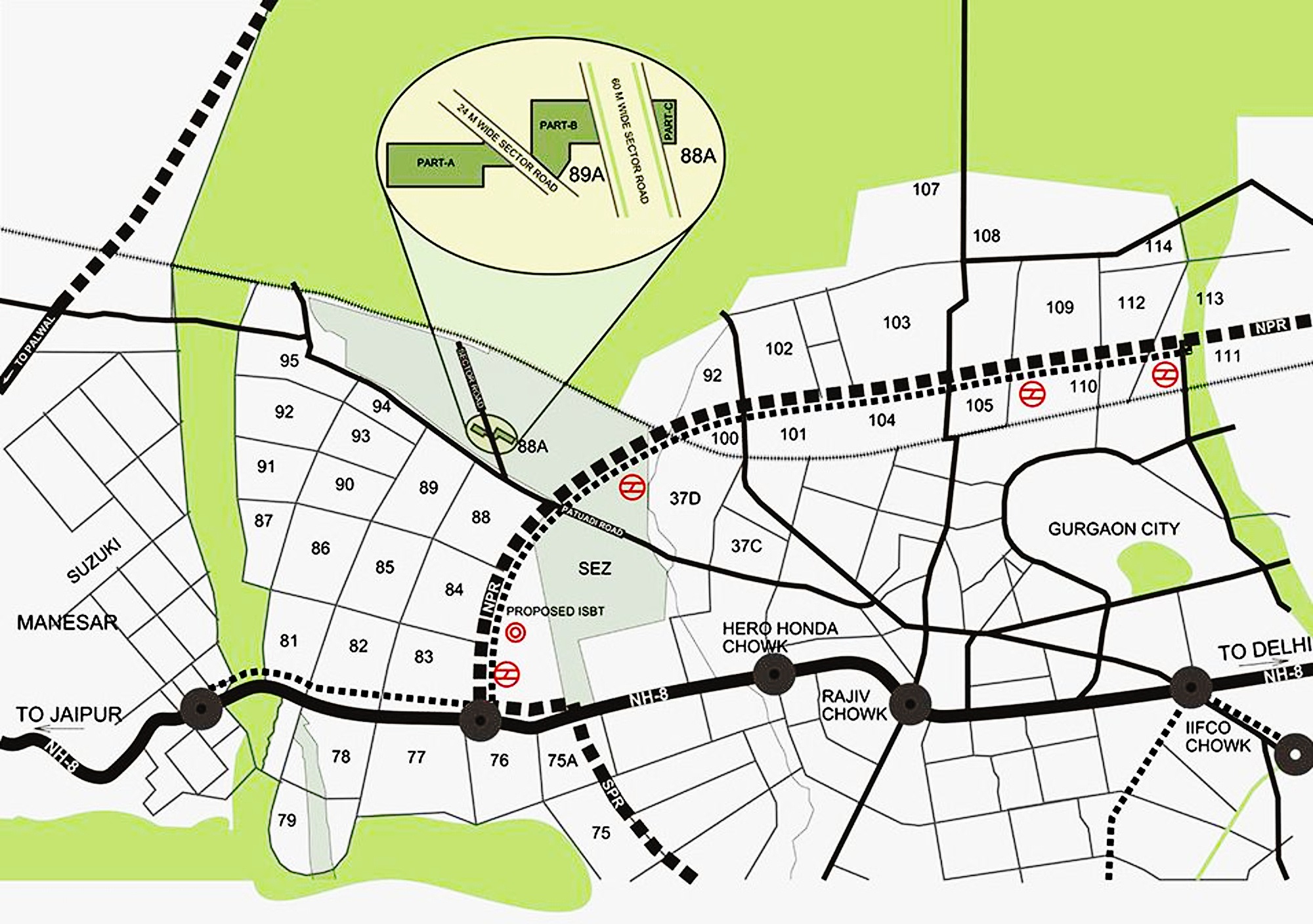 Connected via three major national highways: NH 48 (Delhi–Jaipur Highway), NH 248BB (Dwarka Expressway link), and NH 352W (Pataudi Road)
