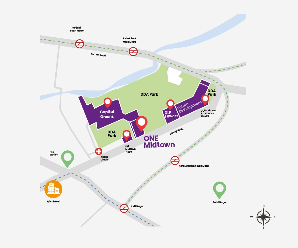 Commercial proximity: DLF Towers, a major commercial hub nearby, hosts offices for global businesses, making ONE Midtown ideal for professionals seeking minimal commute and maximum connectivity to workspaces.