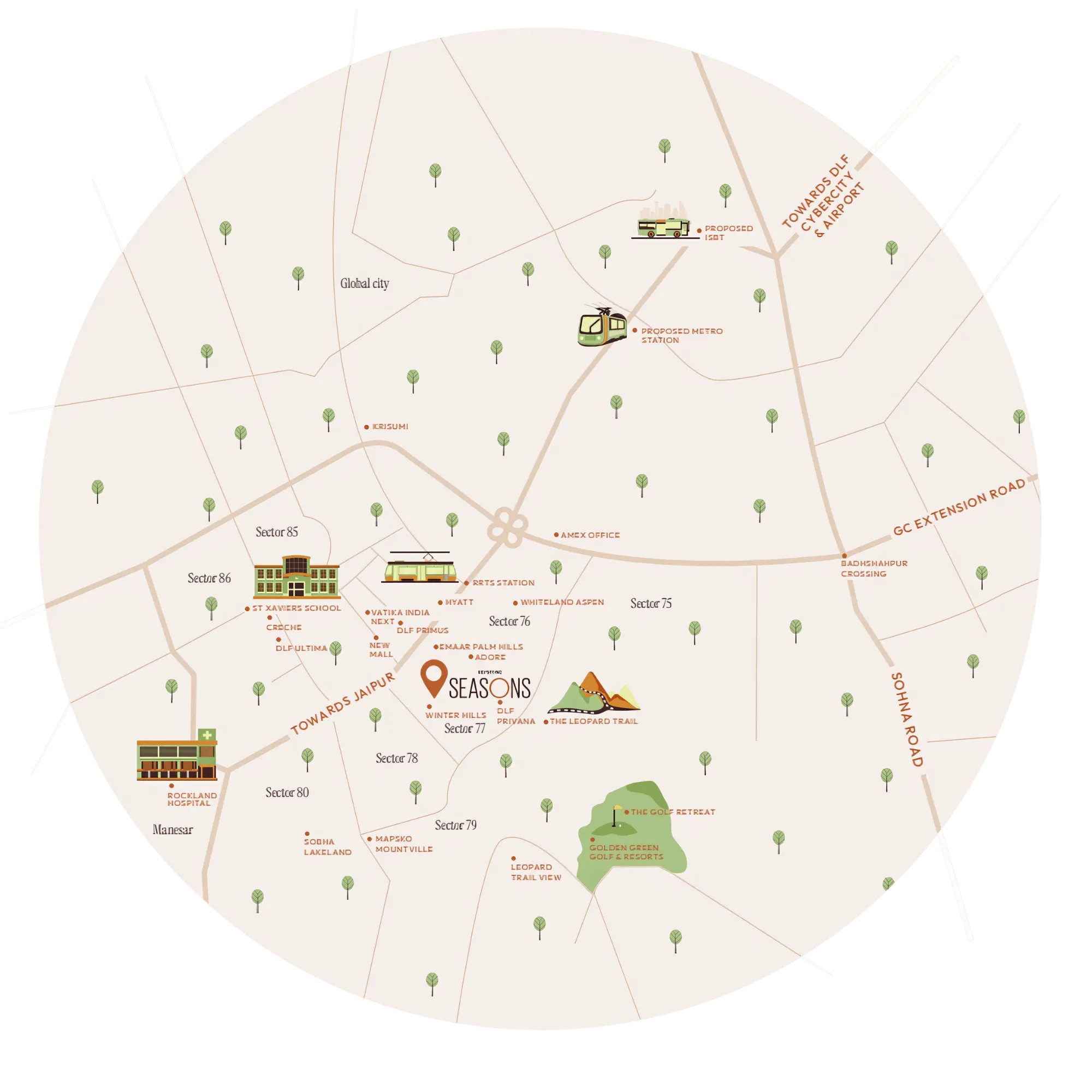 Strategically located in Sector 77, Gurugram, Keystone Seasons offers residents the advantage of exceptional connectivity while maintaining a tranquil environment. Nestled near the Hyatt Regency, it provides quick access to major highways, business centers, schools, and healthcare facilities — everything you need is just minutes away.