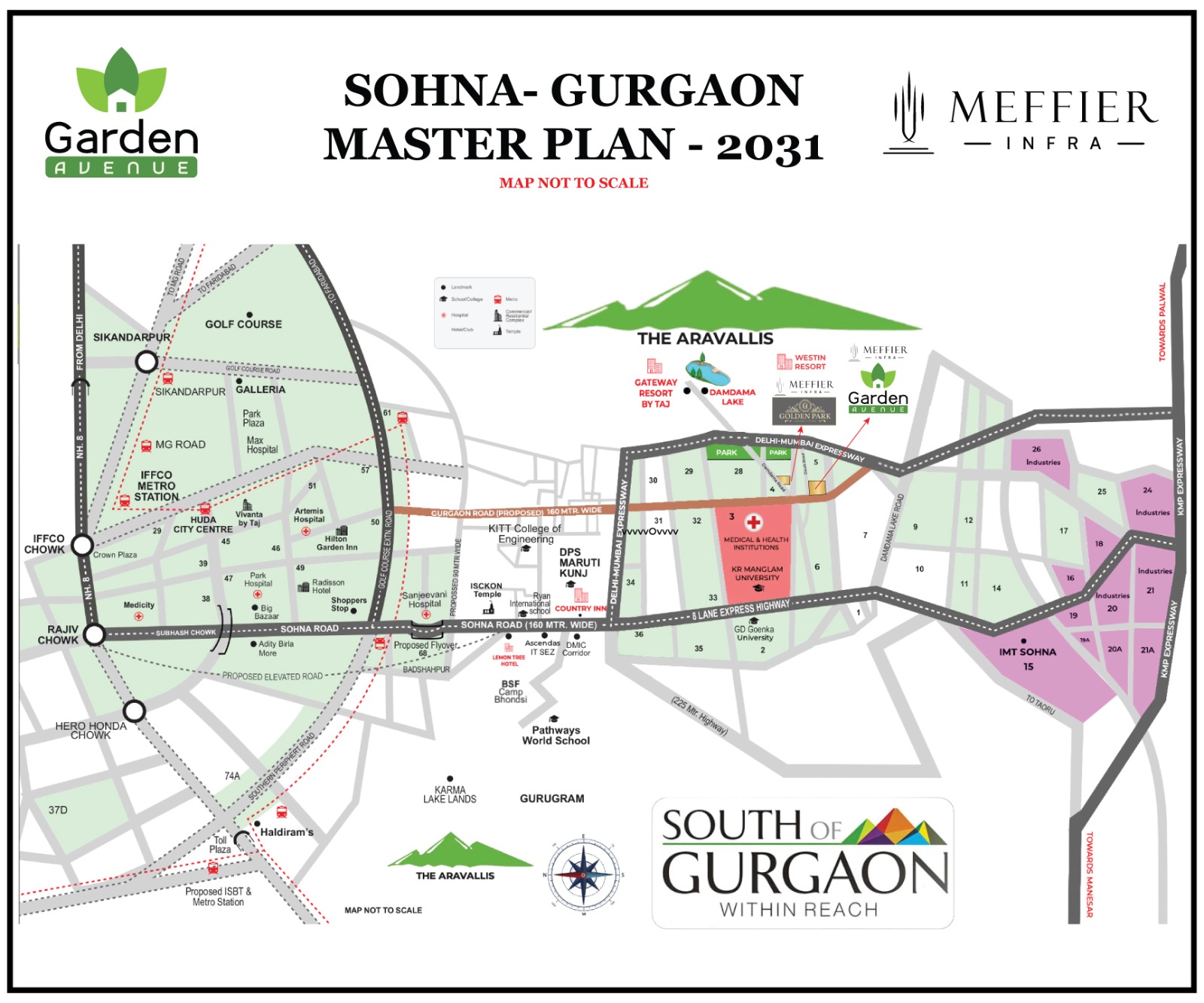 One of the biggest strengths of Meffier Garden Residency is its strategic location in Sector 5, Sohna – South of Gurgaon. Sohna has rapidly evolved into a real estate hotspot, driven by excellent connectivity and planned infrastructure development. The project enjoys seamless access to major roads and hubs across Delhi-NCR: