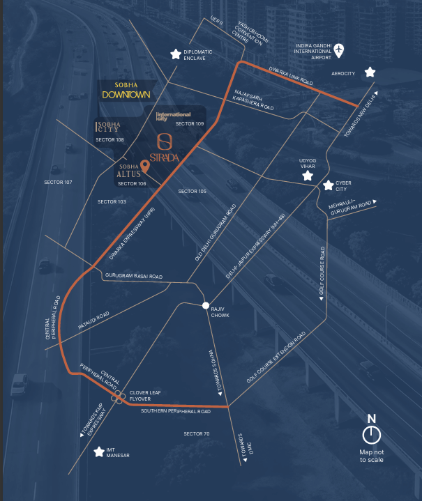 SOBHA STRADA enjoys one of the most strategic locations in New Gurugram. Situated at a prime corner plot, the project is seamlessly connected to Delhi, IGI Airport, and Gurugram’s most prominent landmarks.